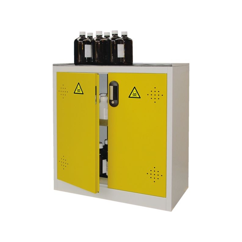 En acier monobloc avec portes battantes à 110°. Fournie avec pictogrammes normalisés. Orifices de ventilation. Fermeture à clé en 3 points. Étagères et bacs de rétention réglables en hauteur sur crémaillères, au pas de 15 mm. Armoire haute à 4 étagères ou basse à 2 étagères. Plan de travail des armoires comptoirs recouvert par un tapis en caoutchouc. Conforme aux articles R5132-66 et R5132-68 du Code de la Santé Publique. Conforme aux recommandations de l'INRS. Charge admissible par étagère : 80 kg UR Coloris : corps gris et portes jaunes Existe avec portes rouges, bleues ou vertes, nous consulter.