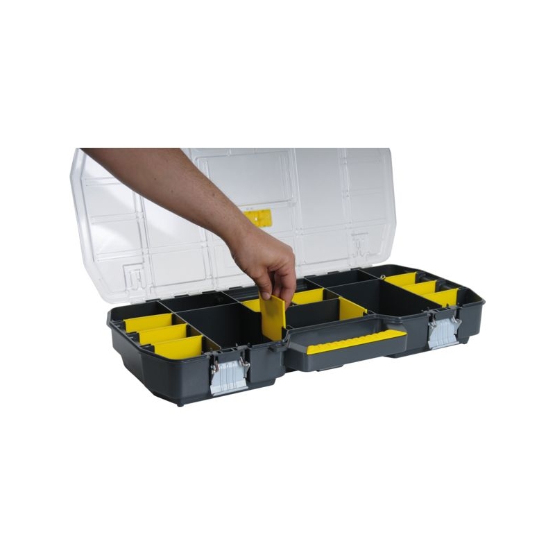 Caisse avec organiseur pour la visserie et petits accessoires. Bouton sur le devant pour libérer la partie haute de la caisse. Grande poignée en aluminium pour faciliter le transport. Volume utile : 53 l Charge maxi : 18 kg Dimensions : 670 x 323 x 283 mm Livrée sans outils.
