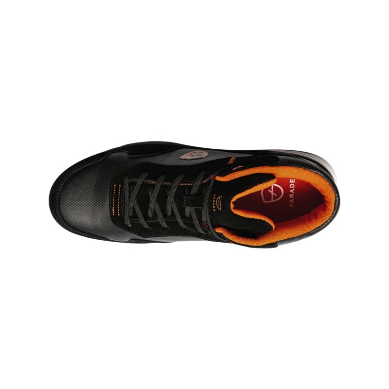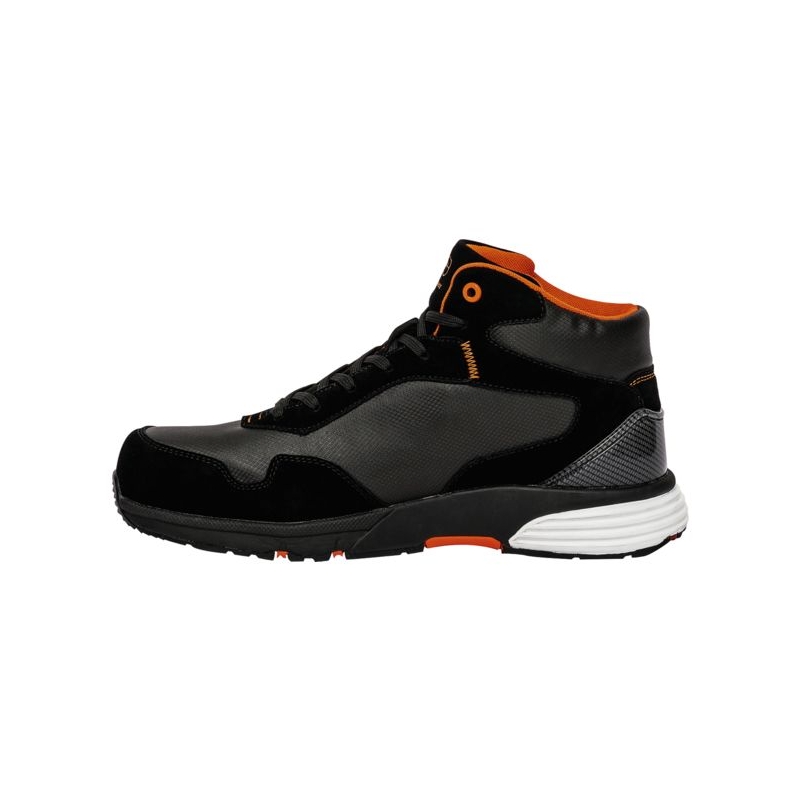 Tige en microfibre et croute de cuir, hydrofuge. Doublure en textile. Première de propreté anatomique et amovible en maille sur mousse PU. Semelle d'usure en caoutchouc / EVA. Semelle antiperforation textile. Embout de sécurité en composite. Poids : 588 g Coloris : noir/orange Pointures : 39 au 48 Norme : CE Cat II - EN ISO 20345 - S3 HRO SRC