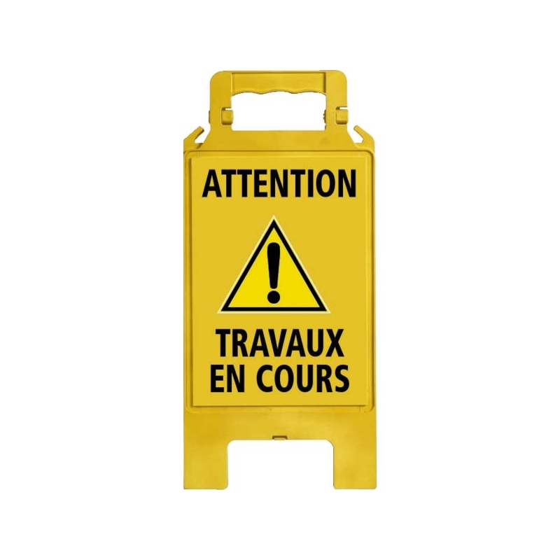 En polypropylène avec renforts de maintien. Utilisation temporaire intérieure et extérieure. Poignée ergonomique, large surface d'impression. Clip de maintien en position ouverte, grande stabilité. Crochets pour chaîne de signalisation. H x l : 600 x 275 mm Épaisseur (plié) : 23 mm