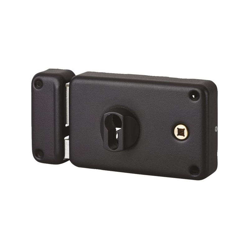 Coffre et gâche acier embouti. Pêne dormant et pêne ½ tour acier zingué. Mécanismes 2 tours. Rappel à l'équerre. Entrée de cylindre et de fouillot en laiton. Livré avec gâche, sans cylindre. Saillie pêne dormant : 5 mm Coffre : 140 x 88 mm Axe : 55 mm Entraxe : 60 mm Fouillot carré : 6 mm Finition : époxy noir Conditionnement : boite
