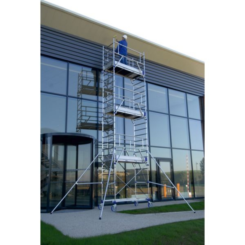 Utilisation sur sol plat ou dénivelé. Usage ultra intensif. En aluminium. Plancher alu/bois avec trappe d'accès et plinthes aluminium amovibles. Garde-corps monobloc. Système de liaison breveté Ergoblock pour un blocage fiable et d'un seul geste des stabilisateurs et des gardes-corps. Montage en sécurité par une seule personne. Roues Ø 200 mm réglables sur 175 mm tous les 12,5 mm. Stabilisateur réglable en longueur. Charge maxi. : 200 kg/m² Norme : NF - EN 1004-1 - Décret 2004-924