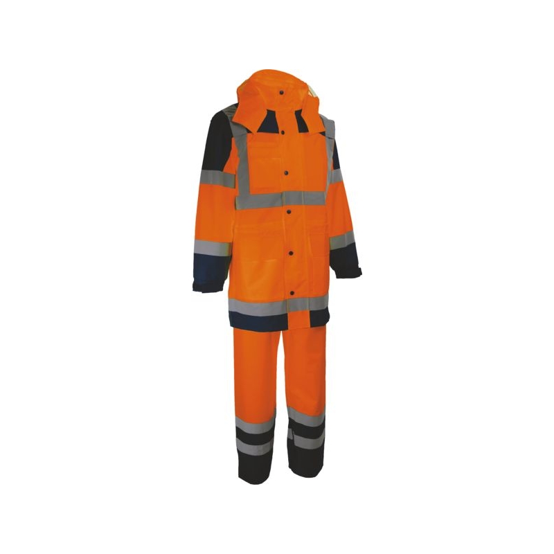 100% polyester Oxford 300D enduit PU. Veste : Bandes rétroréfléchissantes 2 horizontales, 2 brassards et bretelles, coutures étanchées, doublure filet, 2 poches basses, 1 poche poitrine téléphone. Capuche fixe enroulée dans le col avec vision latérale, fermeture centrale à glissière sous rabat pressions, poignets réglables. Pantalon : 2 bandes rétroréfléchissantes, serrage élastique à la taille, braguette. Coloris : jaune fluo/bleu marine, orange fluo/bleu marine Taille : M à XXL Norme : CE Cat II - EN ISO 20471 (3) pour la veste - EN ISO 20471 (1) pour le pantalon - EN 343 (3.1)