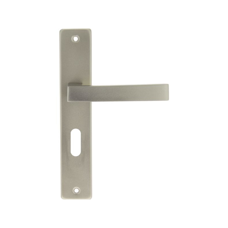 Pour porte intérieure d'épaisseur 40 à 45 mm. Plaque : 220 x 40 mm Entraxe de fixation : 195 mm Entraxe de serrure : 70 mm Longueur béquille : 122 mm Saillie de la béquille : 45 mm Fouillot carré : 7 mm Finition : inox velours Conditionnement : boite 100% recyclable.