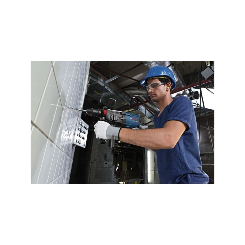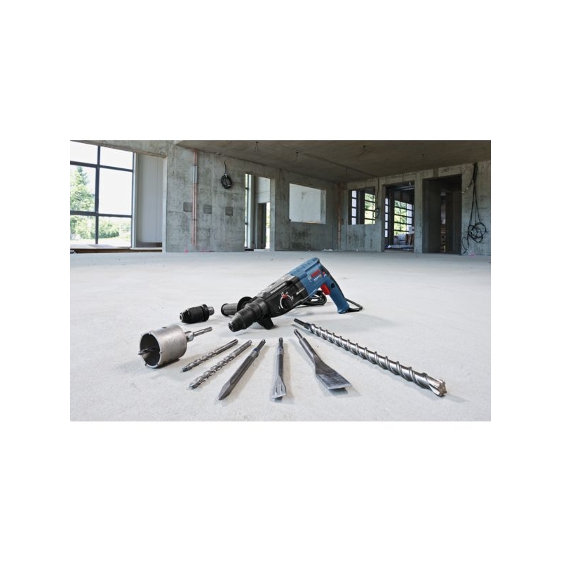 Orientation de l'outil, embrayage de sécurité, stop de rotation, stop de frappe et mandrin interchangeable. Emmanchement : SDS-Plus Puissance : 880 W Puissance de frappe : 3,2 J Vitesse : 900 tr/mn Cadence de frappe : 4000 cps/mn Taux de vibrations : 11 m/s² Poids : 3,100 kg Livré en coffret L-Case avec poignée supplémentaire, mandrin Quick-Change, mandrin interchangeable SDS-Plus, jauge de profondeur.